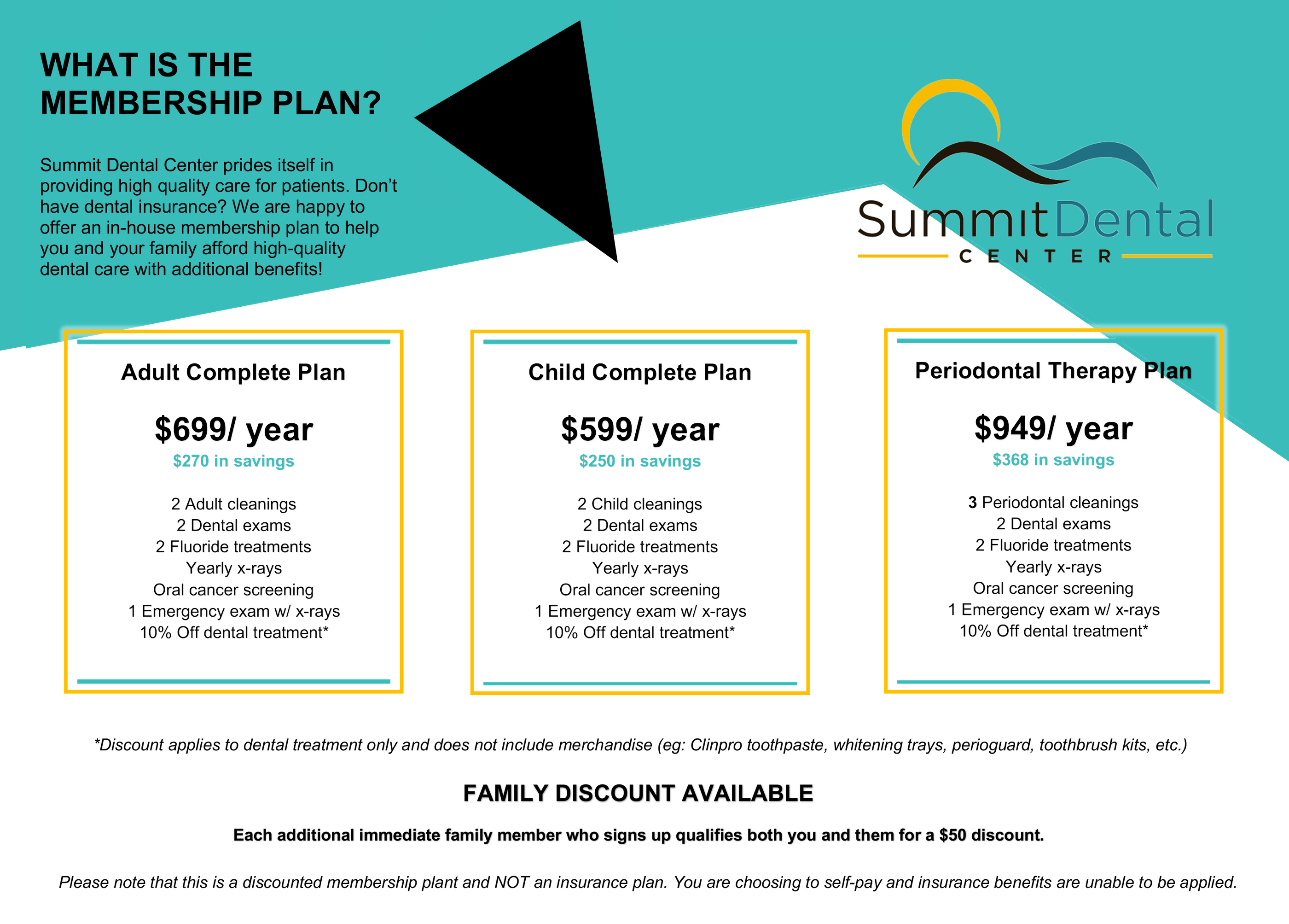 At Summit Dental Center, we’re dedicated to providing exceptional, high-quality care tailored to every patient’s needs. Don’t have dental insurance? No problem! Our in-house membership plan is designed to make top-tier dental care accessible and affordable for you and your family. With comprehensive coverage for preventative care like cleanings and exams, discounts on restorative and cosmetic procedures, and no annual maximums or deductibles, maintaining a healthy, beautiful smile has never been easier. Plus, our family plans ensure that everyone in your household can enjoy these benefits. Enrolling is quick and stress-free—quality dental care is just a step away!